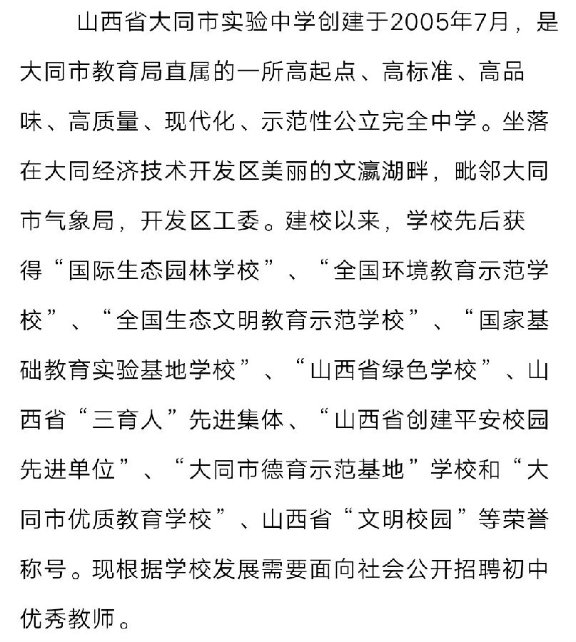 2、學(xué)校招聘領(lǐng)導(dǎo)小組對(duì)應(yīng)聘人員書面材料進(jìn)行審定后電話通知面試(專業(yè)考試)、試講的時(shí)間和地點(diǎn),未接到通知即為未通過審定或考試,恕不另行通知。