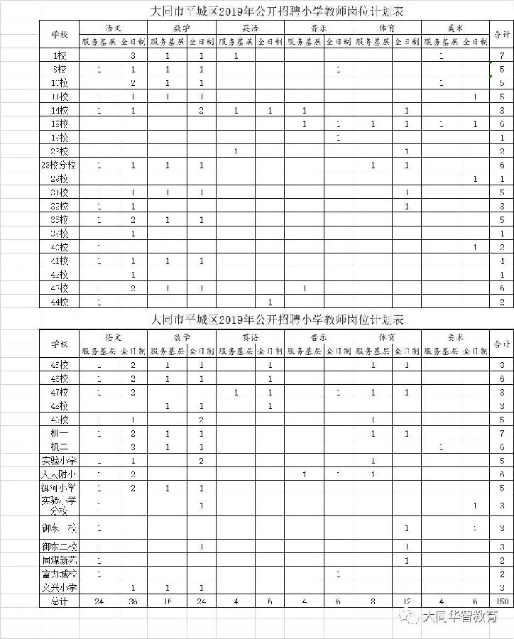 為進一步優(yōu)化我區(qū)教師隊伍結(jié)構(gòu),不斷充實教師力量,根據(jù)國家、省、市事業(yè)單位公開招聘工作人員有關(guān)規(guī)定,經(jīng)區(qū)委、區(qū)政府研究決定:面向社會公開招聘小學(xué)教師150名。經(jīng)區(qū)招聘領(lǐng)導(dǎo)組研究制定,并報大同市人力資源和社會保障局對招聘實施方案批復(fù),現(xiàn)將大同市平城區(qū)2019年公開招聘小學(xué)教師相關(guān)事宜公告如下: